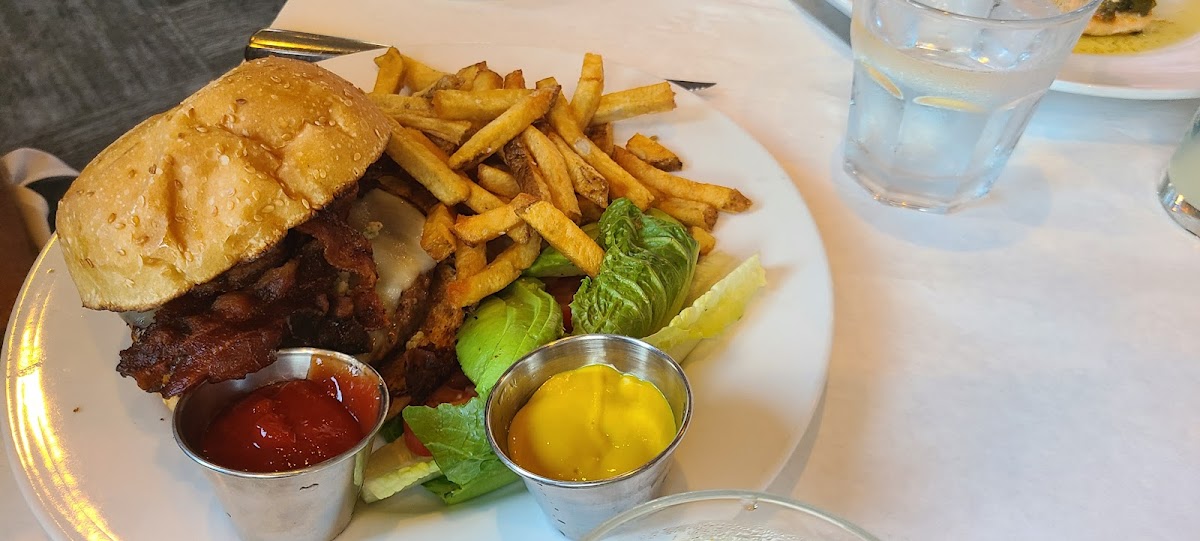 Good food though pricey. 5 of us went for lunch today to celebrate a coworkers birthday. 2 people ordered sodas, everyone ordered entrees which ranged from $22 - $30. The bill came to $190 before tip. Our friend did get some complimentary vanilla ice cream. Be careful asking for more bread. The server won't tell you but they charge $6 for a serving of 5-6 slices of french bread. It's not even buttered (and the butter they provided was hard, just out of the refrigerator apparently). Pictures chicken sandwich with soup.